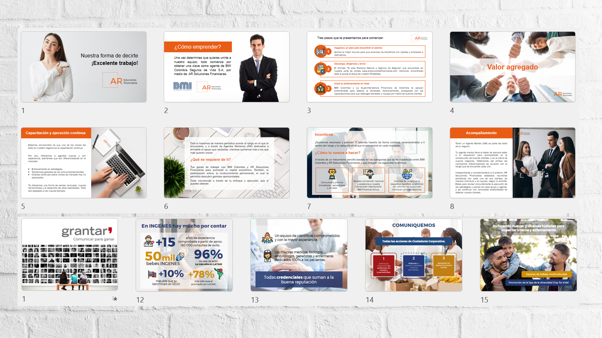 – Benchmark (searching references) – Definition of content – Template selection – Typographies – Icons – Color palette